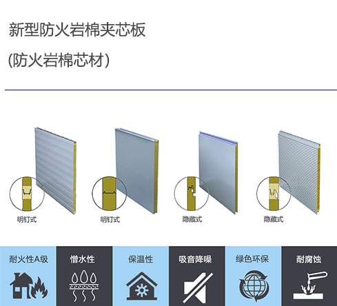 巖棉夾芯板是選用兩層高品質(zhì)的彩涂涂層鋼板或其他精密壓型的金屬板做面板,輥壓成型 后,將分條后的巖棉90度旋轉(zhuǎn)(使其纖維垂直于上下兩層鋼板),通過高強(qiáng)度、高粘結(jié)力、 高防火的粘結(jié)劑,將優(yōu)質(zhì)巖棉與金屬板粘結(jié)、復(fù)合而成美觀、平整、剛韌的建筑板材