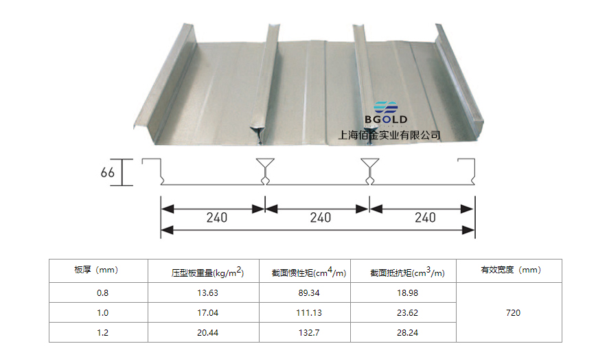 波高(又稱肋高)為66mm;波距為240mm;板的有效覆蓋寬度為720mm的板型。