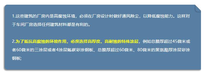 行業(yè)特點:化工產品具有揮發(fā)性特點,容易產生酸性或堿性等腐蝕性較大的揮發(fā)性物質,遇水后容易形成露珠附著在彩板表面,對彩板的涂層產生腐蝕,并有可能進一步腐蝕到鋅層甚至鋼板。
