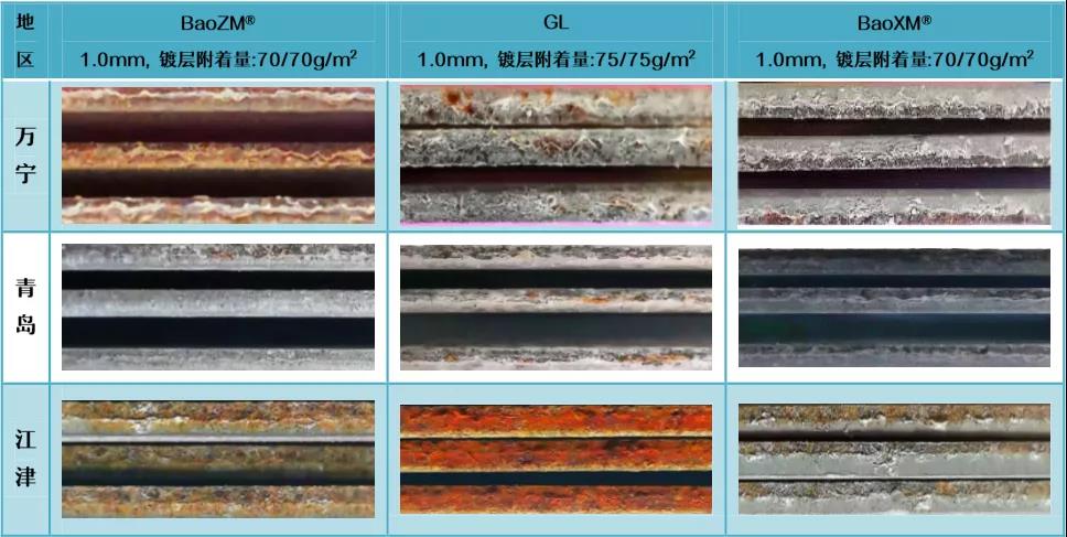 根據(jù)戶外掛片結果,BaoXM®鍍層在典型海洋氣候、酸雨氣候均表現(xiàn)出較熱鍍鋅、鍍鋁鋅更強的環(huán)境耐蝕性。