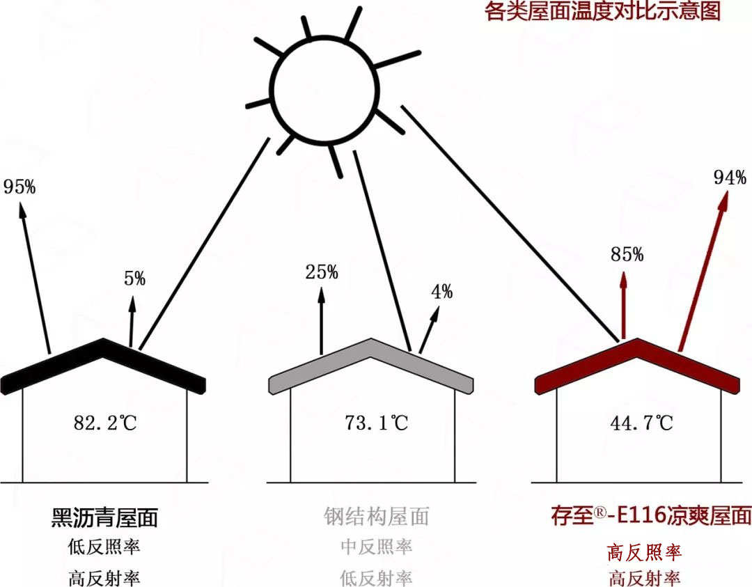 這種能使被涂覆建筑在太陽光照射下產(chǎn)生降溫效果的隔熱涂料引起了廣泛的關(guān)注,市場(chǎng)上出現(xiàn)了各類太陽熱反射隔熱涂料、熱反射隔熱保溫涂料、防水防腐隔熱保溫涂料、節(jié)能保溫隔熱涂料,促使建筑屋頂屋面、墻體節(jié)能。提倡建筑節(jié)能,發(fā)展綠色房屋建筑、促進(jìn)建筑節(jié)能已經(jīng)成為我國(guó)節(jié)能減排戰(zhàn)略的重要組成部分。其中,存至®-E116隔熱降溫系統(tǒng)因其隔熱降溫效果顯著,熱反射率高,涂層質(zhì)量輕、耐久性好、施工方便、易于維護(hù)等特點(diǎn)受到了更為廣泛的關(guān)注。