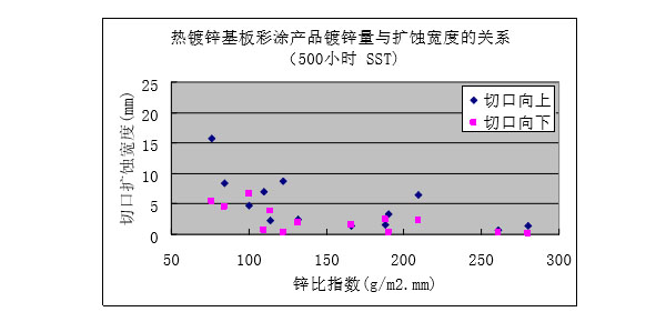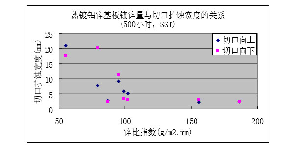 ?保留切口樣板的鹽霧試驗(1500小時)后,隨著鍍鋁鋅層重量增加,紅銹出現(xiàn)的比例降低。