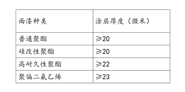 ?、叟浜夏途眯愿叩耐繉樱瑢氫搶υ擃惒释夸摪宓淖畹湾儗又亓恳策M(jìn)行了限制,例如氟碳產(chǎn)品熱鍍鋅鍍層重量不小于110g/m2,鍍鋁鋅鍍層量不小于75/75g/m2