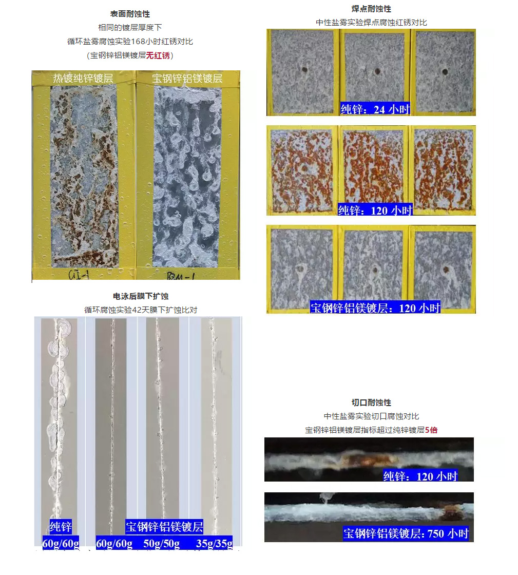 鋅鋁鎂優(yōu)異的耐蝕性體現(xiàn)在如下幾個方面:平面耐蝕性;切口耐蝕性;焊點耐蝕性;電泳后膜下擴蝕。