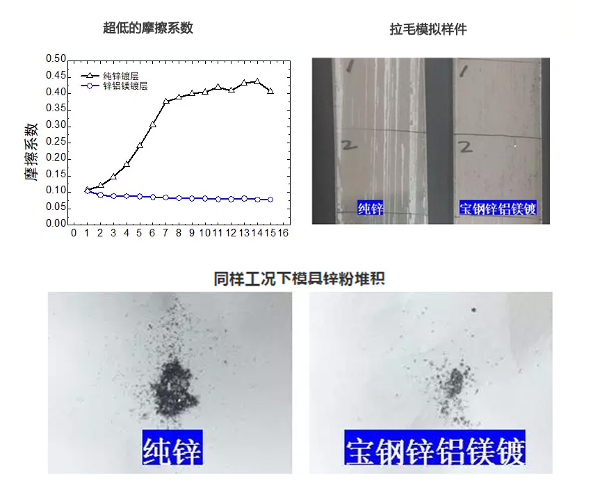 除此之外,寶鋼鋅鋁鎂鍍層還有具有優(yōu)異的成形性能,更適合汽車零件加工,如:摩擦系數(shù)低、鍍層磨損少、拉毛缺陷輕等優(yōu)點。我們還是拿數(shù)據(jù)說話: