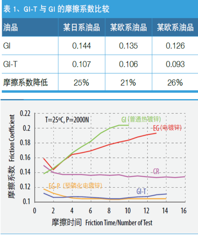 熱鍍鋅鋼板通過T處理可以降低表面的摩擦系數(shù),穩(wěn)定摩擦系數(shù),從而減少汽車廠的模具清潔次數(shù)。(下列性能對比以GI-T為例)