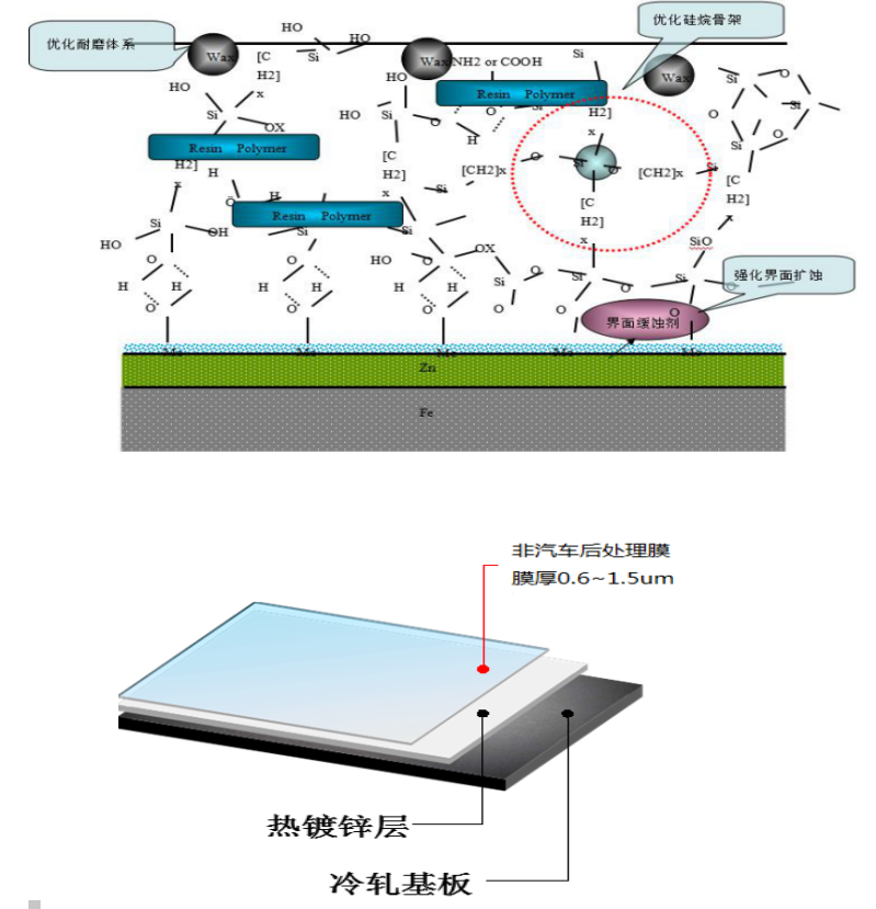 目前湛江冷軋能生產(chǎn)的產(chǎn)品有鈍化、耐指紋以及家電自潤滑三種,膜厚從0.6~1.5um不等,綠色環(huán)保,其結(jié)構(gòu)皆以硅烷基來作為骨架,有機物作為主要填充物,加入性能改良物質(zhì)如表面耐磨劑等改善所需的性能指標,膜結(jié)構(gòu)圖和斷面示意圖如下: