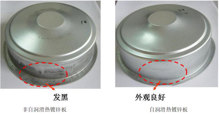 故此自潤滑處理后,帶鋼沖壓潤滑性能優(yōu)秀,沖壓拉伸面不易變黑,適合無油沖壓,減少了清洗等環(huán)節(jié),與常規(guī)鈍化、耐指紋處理的材料相比,能消除材料的沖壓不良現(xiàn)象,如下圖所示。