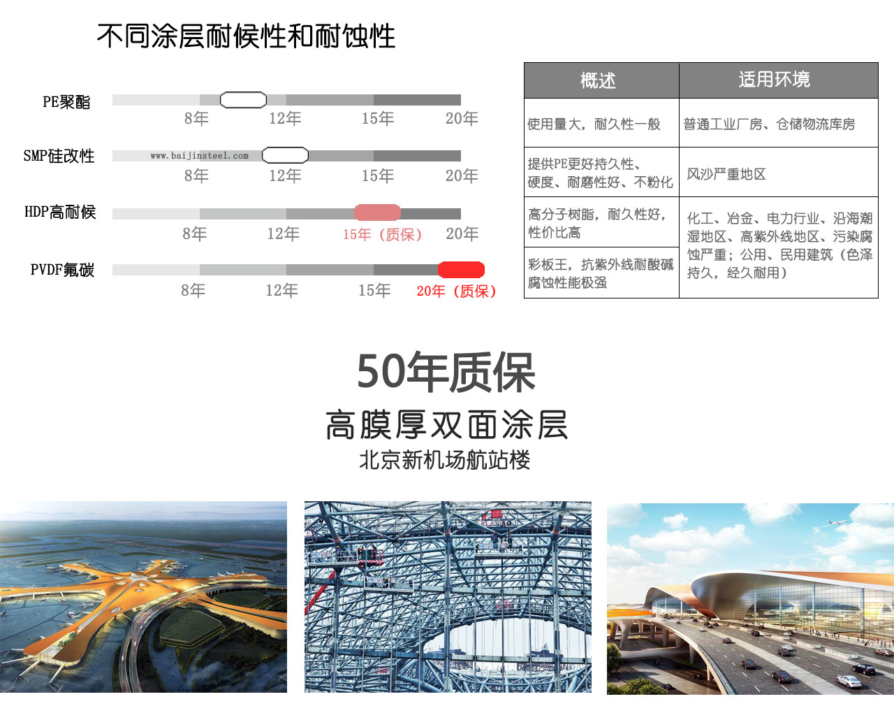 近年來(lái),國(guó)內(nèi)開(kāi)始盛行以三氟氯乙烯和乙烯酯單體共聚的含氟樹(shù)酯,大量就用于建筑面積的外墻和金屬板,由于使用易水解的乙烯酯單體和氟的含量較PVDF低(30%左右),因此基耐候性與PVDF比較,有一定的差距。我公司所供應(yīng)的寶鋼,燁輝,聯(lián)合等國(guó)內(nèi)大型鋼廠生產(chǎn)的氟碳涂層,其涂層PVDF含量量不小于70 %(其它為丙稀酸樹(shù)酯)PVDF氟碳彩鋼板,提供20年質(zhì)量保證書,保證在20年內(nèi)涂層不脫落,不粉化,不龜裂,不退色。