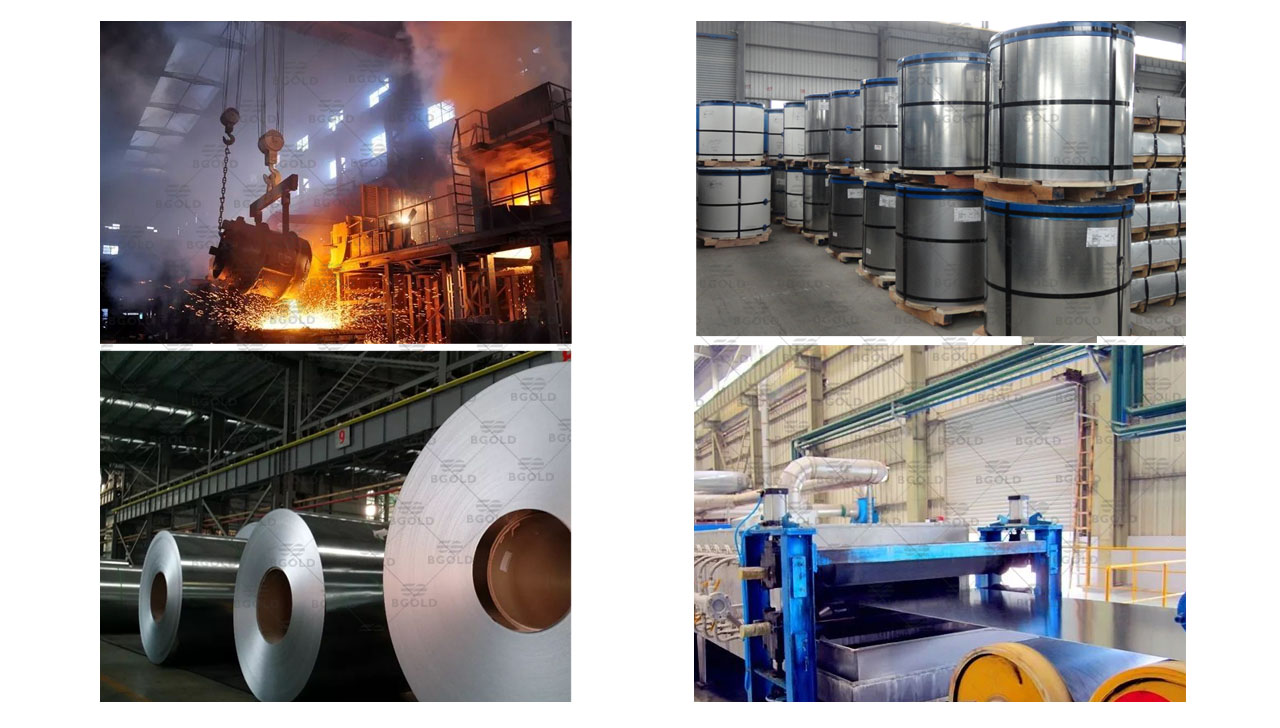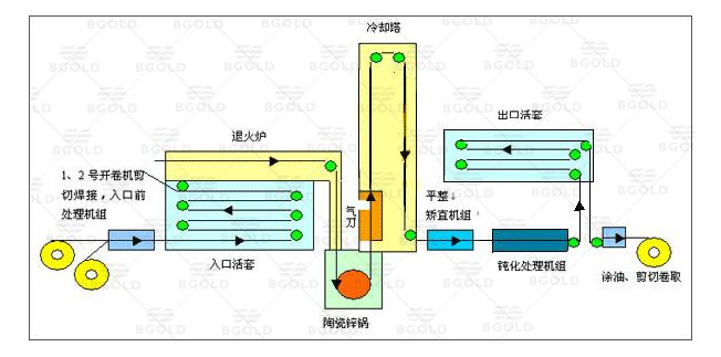 生產(chǎn)加工鍍鋅鋼卷可以分為三大步:首先將整卷帶鋼進(jìn)行酸洗除銹、除污,讓鍍鋅鋼帶表面達(dá)到光亮干凈的效果;酸洗后,通過氯化銨或氯化鋅水溶液或者氯化銨和氯化鋅混合水溶液中進(jìn)行清洗,然后送入熱浸鍍槽內(nèi),進(jìn)行鍍鋅工藝;待鍍鋅工藝完成后即可入庫包裝。