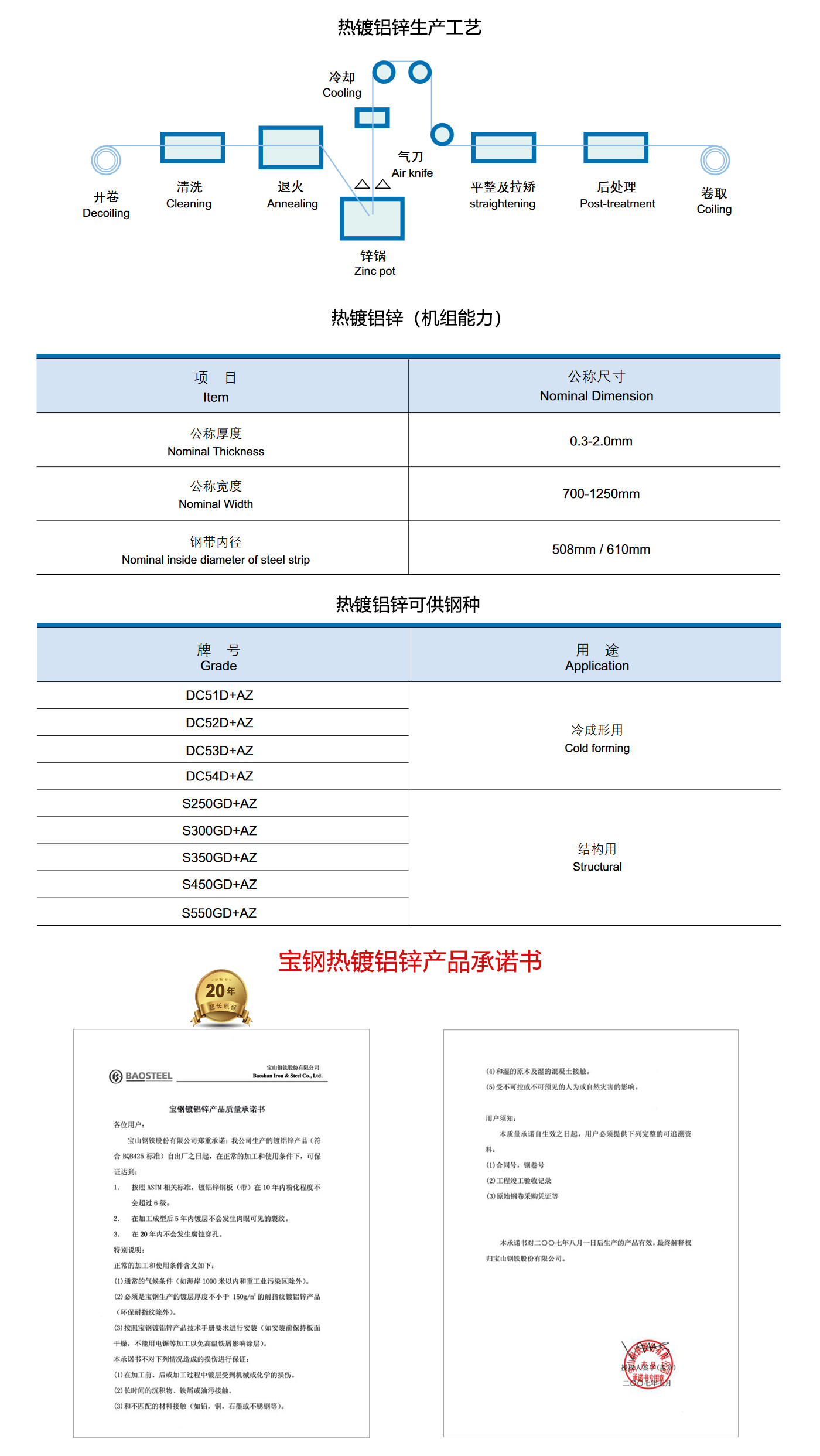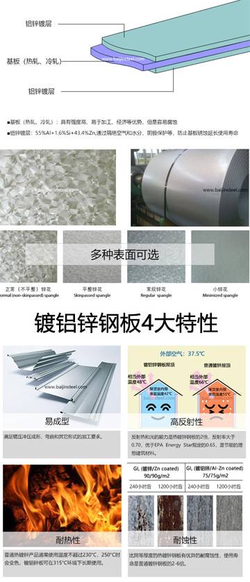 熱鍍鋁鋅鋼板是以各種強(qiáng)度和厚度規(guī)格的冷軋鋼板為基材,連續(xù)熱鍍鋁鋅生產(chǎn)線生產(chǎn)的、由鋁鋅合金組成的鍍層,鍍層中鋁的質(zhì)量百分?jǐn)?shù)約為55%,硅的質(zhì)量百分?jǐn)?shù)約為1.5%,鋅的質(zhì)量百分?jǐn)?shù)約為43.5%,經(jīng)過大量實(shí)驗(yàn)證明該配比具有最佳抗腐蝕性能。融合了Al的物理保護(hù)和高耐久性以及Zn的電化學(xué)保護(hù)特性,在其表面呈具有高裝飾性的光亮銀灰色澤及規(guī)則的花紋,并具有浮凸感。